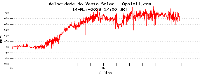 A velocidade do vento solar está bastante elevada, e ultrapassa a marca de 600 quilômetros por segundo, com riscos significativos de ocorrências de tempestades géomagnéticas.